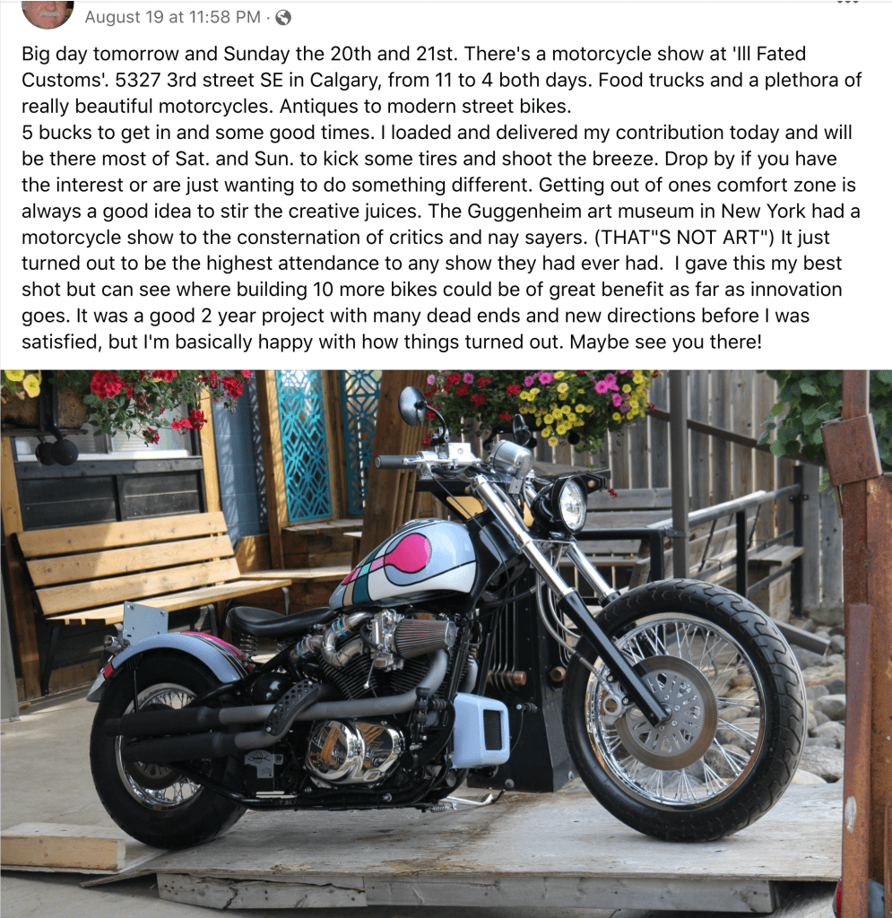 I chose this project with the express purpose of learning some new processes or ideas about things I haven’t done before. I have built two other bikes back in the 1970’s but were simple builds and mostly bolt together projects. The design of those bikes was the most important part. For this project I chose a bike that basically has no accessory parts to buy. If I had chosen a Harley Davidson, there are 500 companies making thousands of ‘aftermarket’ parts, then the project gets pretty easy as far as selecting parts to make up the bike. So my choice meant I would need to design and build almost everything myself. That was the over riding rule I set out for myself. Sometimes things would seem to go well but after other parts were built and added, there could be conflicts that couldn’t be resolved. Then it was back to the drawing board. All in all, most things worked out and I learned new things that are now part of the skills I can say I own. Some things had to be redone and others performed well. Many new concepts were learned and remembered and better yet, give rise to whole new directions yet to be realized. When you work within your capabilities and comfort zone, you only get to perfect a few things you already know. When you go where no one has gone before, or at least, you haven’t gone before, you either learn things or you give up. If you never give up, you can’t fail. Only a small number of people at the show this past weekend really understood the bike for what it is, but that’s Ok. The few that saw what I accomplished was enough. By the way, most of the ladies really liked the paint job I did. California colours. Very different than most bikes. Maybe my ‘art’ bike could go in the Guggenheim.