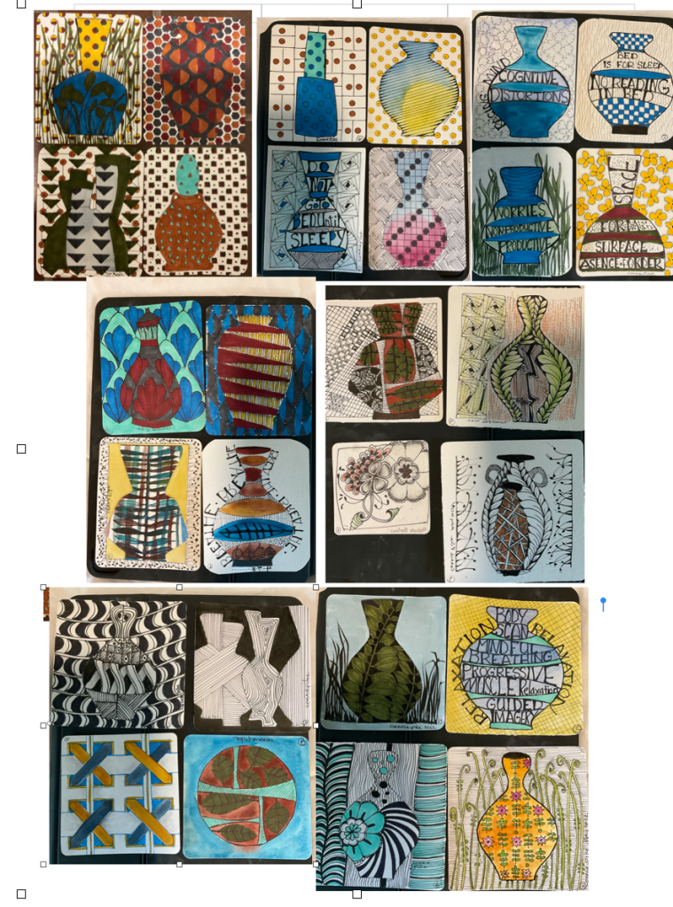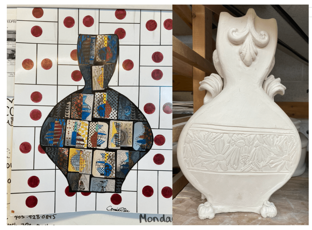 These are 4″ x 5″ cards that I drew and colored with coptic pens. On a 22″ cardstock sheet, I made a larger vase by making a collage of some of the cards. Still drawing more cards and doing research but I was itchy to get my hands in the clay so I decided to make the above flat vase. That was making one of the cards bigger, using my lino block for the added pattern. The handles, feet and added motifs are from a press mold at the studio.