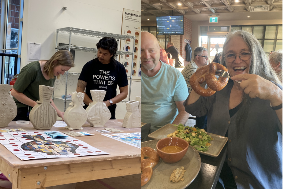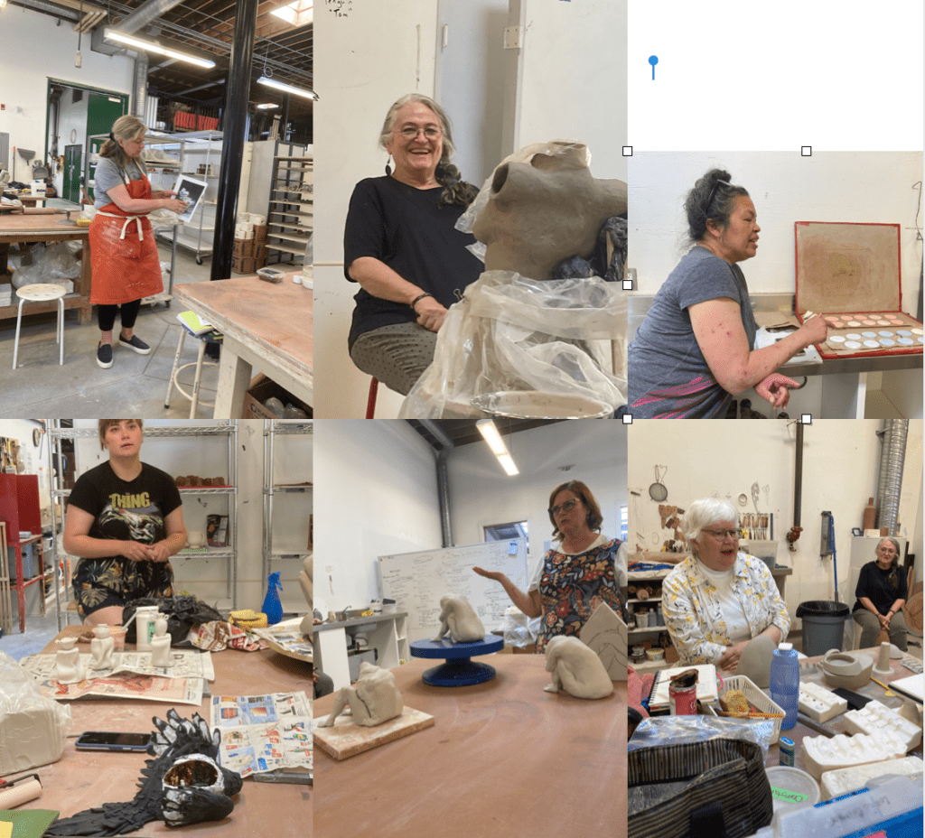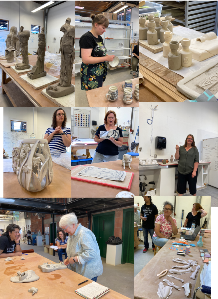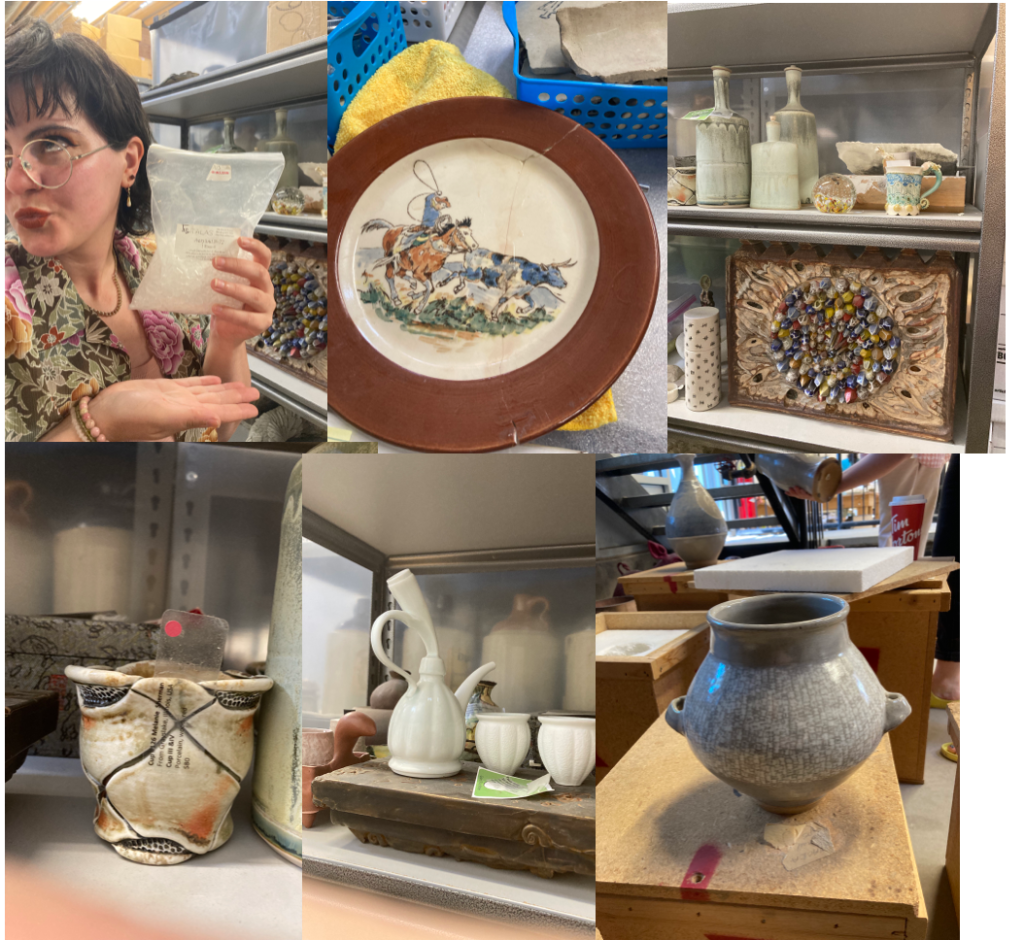 This is one of my favorite cards so here it is in person…raw clay of course. Not quite finished but close.Remember this card…Thought I would try it in clay…You can see Louise in the background…We shared a table.I made a smaller one combining these two cards. My last chance..the days were running out..We worked most evenings too….I decided to make one that had torn edges…I didn’t have a card for this one.Here’s a process shot…I used slabs and cut out the shape of the vase and 3″ strips which I textured for the sides and added a bottom and sometimes extra clay on the rim.Last one…a paddled shape…I did a lot of paddling on all the vases to get them to their desired shapesMeanwhile theres lots going on…Dan gave a tour of the studios…Here he is showing us their glaze mixer…And on the right it a picture of Rob Froeses’ work.Lots of old metal around to get ideas for texture and pattern. Brendan doing a demo..a chinese fortune cookie!…Ceramic panties in the girls washroom on the floor. Annette showing us her metal that she makes cutters out of..Brendan talking to Jean..Angie talking about her pierced piece and the tools she made out of hack saw blades.Ruth-Ann, Donna, Karen, Leandra, Sheena and Louise showing their ideas of what they want to work on half way through the ten days..Rob Froese was unloading a very successful soda firing.Brendan doing a demo, drawings of different types of vases, Donna drapping her figure with cheesecloth dipped in slip. Louise working on her sculpture and Angie’s 2nd piece in progress.A Tour of the Interpretive Center at MedaltaA tour of the archives. The conservator showing us the glue she uses to restore pieces.Several pieces in the archives. I should have taken a picture of the rows and rows of medalta past work-they have 10 to 20 of each item which she wants to cut back to three. Looking into the studio, ideas for more vase shapes, Jeans solution for hanging her tile. Two pictures of our residence.Annettes Show at the Esplanade-Down Town Medicine HatRuth Ann’s workLast Day-My table full of Vases. Ready for the CritLast Day-Crit of Everyone’s WorkAmy Duval, Residency Coordinator Medalta International Artists in Residence Program and Brendan handing in our tags. And we did try out a few places to eat in Medicine Hat. Donna showing off her pretzel..it was delicious.Back in my studio in High River I Dried all the vases slowly,, then stained them and glazed them.Fired!!Fired!Thanks Brendan for a fantastic 10 days. Brendan posted a video on his instagram site…Brendan TangAnd I made 7 more a bit larger!!!