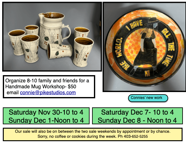 It’s time again for our Christmas Sale. How time flies. If you’re from the city, you might want to do some xmas shopping getting away from the big mall parking and crowds experience and come to High River for the day. We have a pottery shop filled with fine hand made items. I’m sure that men in your life, might like something a bit different than a tie or housecoat. We have mugs- all sizes even giant ones and jugs and dishes and Thai Noodle Bowls, Chopstick bowls, paintings and sculptures and interesting small gift items. And we have 20% off of everything in the shop. It’s two weekends and (the week in between by appointment.) We don’t keep regular shop hours, so we recommend you give us a shout if you need to come during the week. 403-652-5255 (answering machine and we’ll get back to you) or 403-652-5584 for the studio number. If you come to our sale, I’ll give you a tour of the studio and you’ll have a better understanding what an artists’ life is all about including the processes we use everyday. After 52 years we have some interesting stories to tell and I will gladly give you advice on how to boost your career as an artist. I love giving tours and telling the stories that allowed Pike Studios to be born.