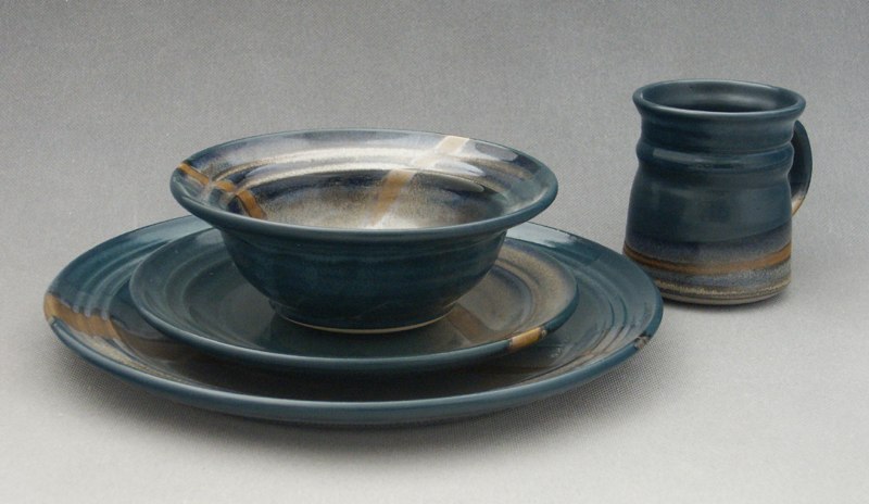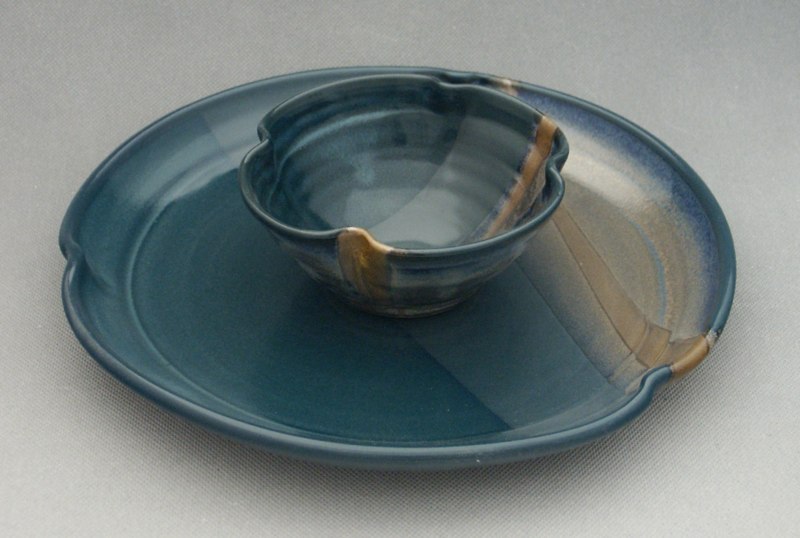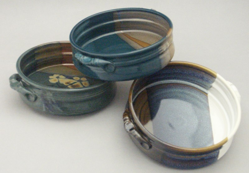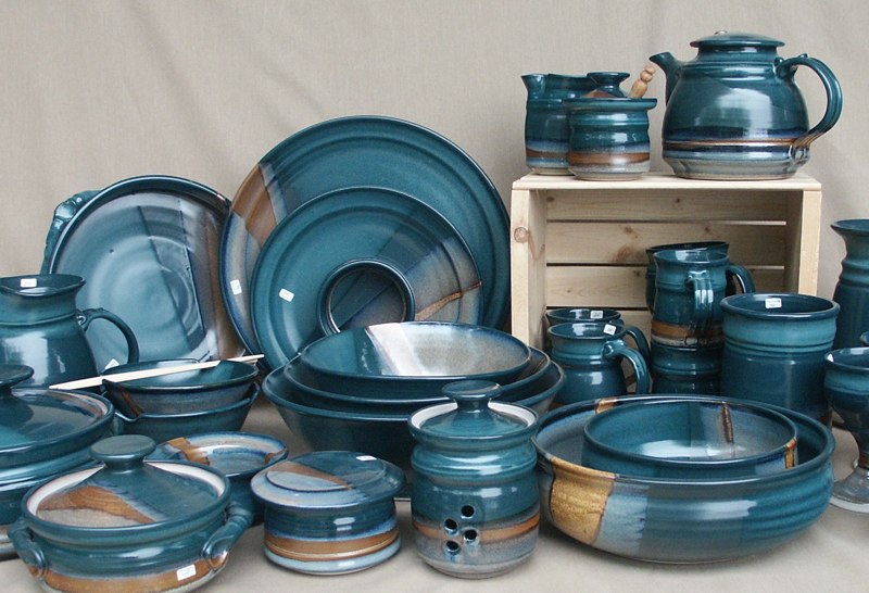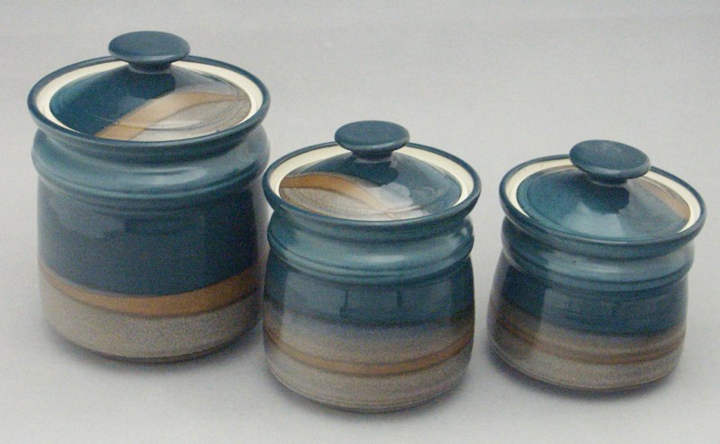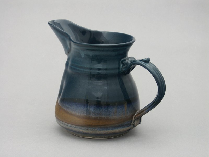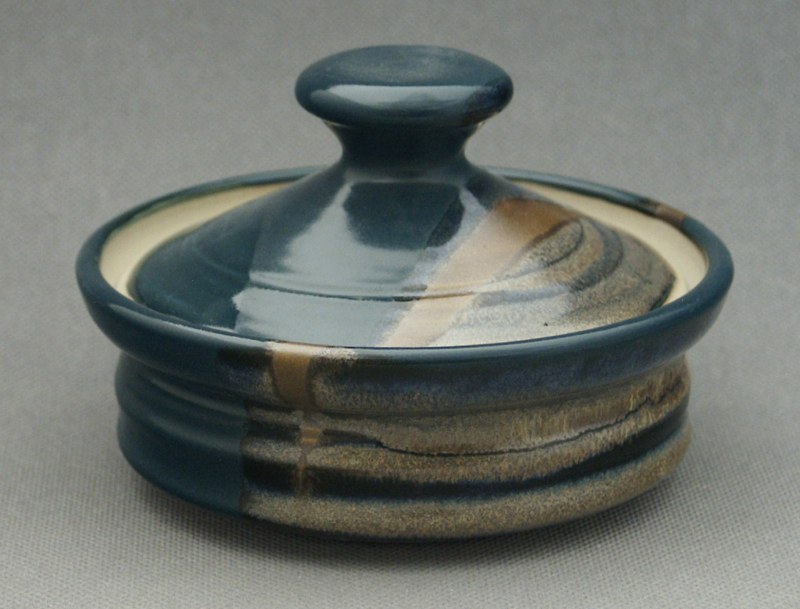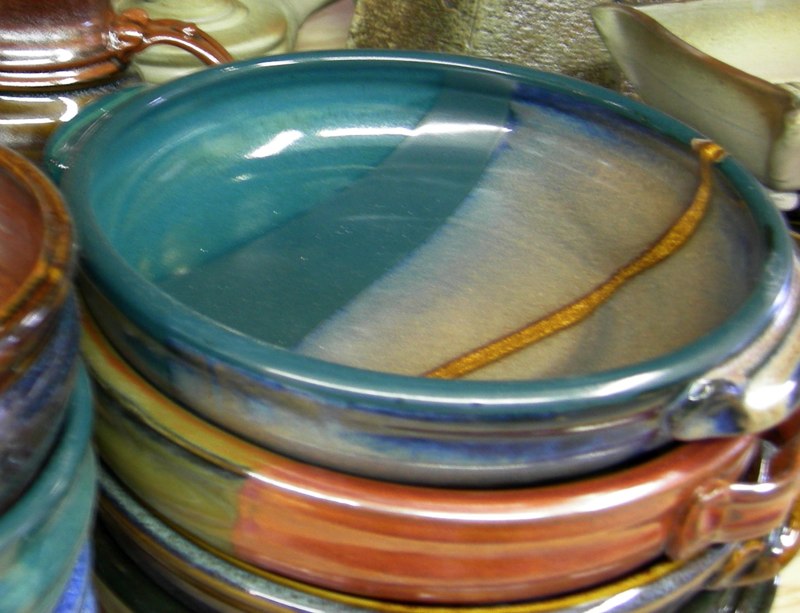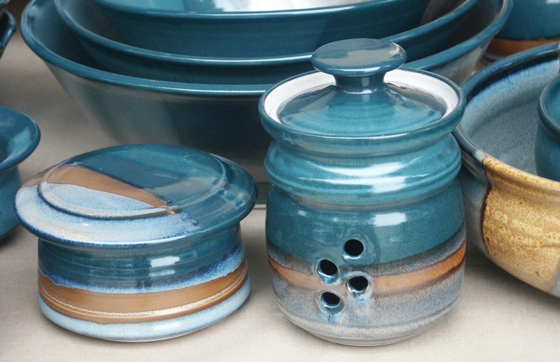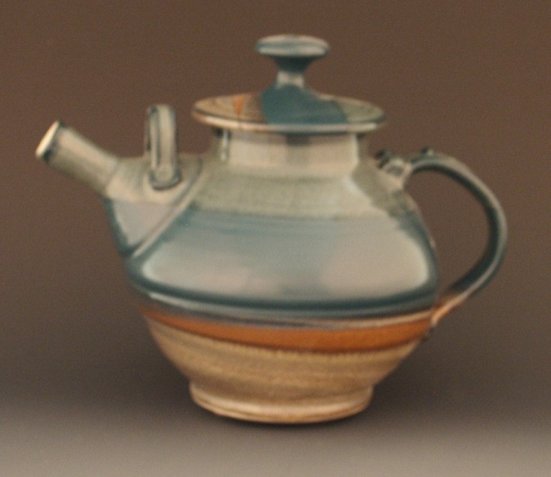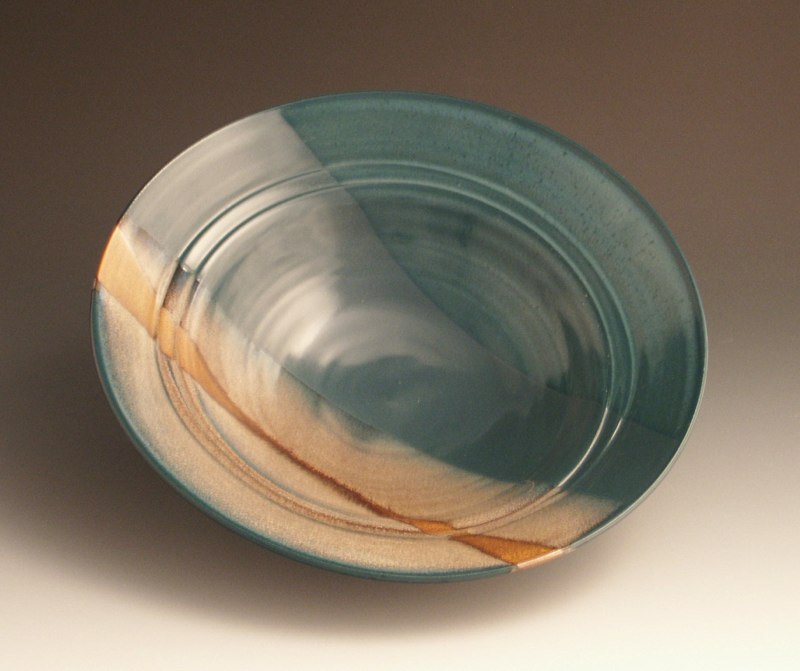 Semi-Gloss green and teal and amber overlapped glazes with over glaze decoration.